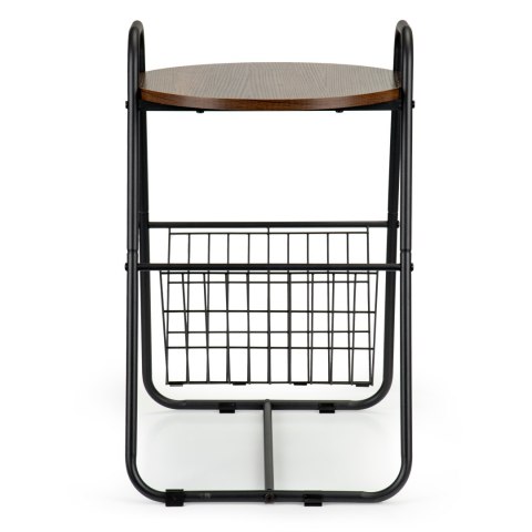 Konstrukcja stoliczka wykonana jest z metalowych rurek malowanych proszkowo, dzięki szeroko rozstawionym nogom mebel zachowuje odpowiednią stabilność. W górnej części znajduje się funkcjonalny, okrągły blat wykonany z MDF-u i pokryty okleiną imitującą kolor i fakturę drewna. Pod blatem umieszczono druciany gazetownik, który pomieści Twoje ulubione czasopisma i książki.
